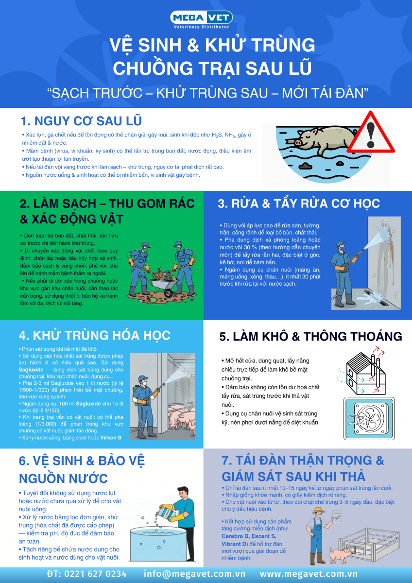 Nếu không làm sạch – khử trùng – kiểm soát nguồn nước đúng cách, mầm bệnh dễ bùng phát, ảnh hưởng trực tiếp đến đàn vật nuôi. Vì vậy, hãy bắt đầu phục hồi chuồng trại đúng quy trình: