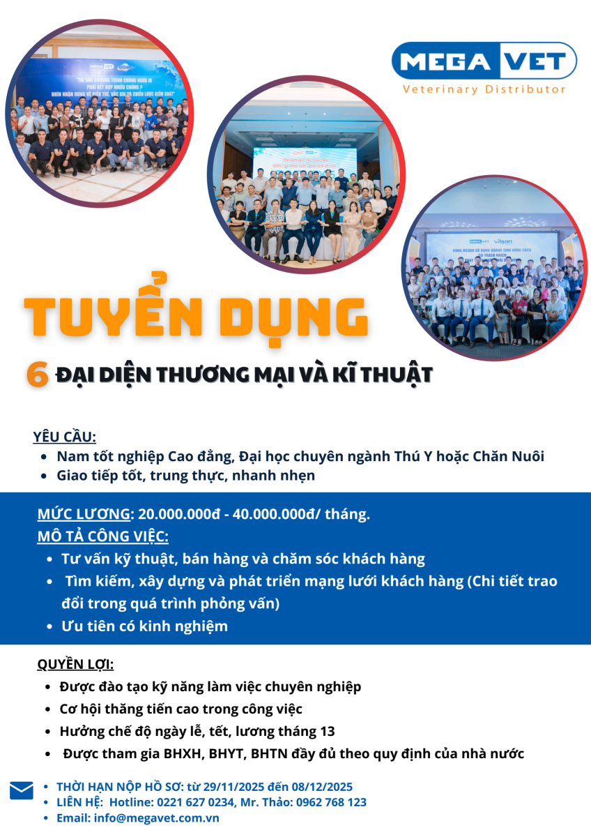 Megavet tìm kiếm 6 Đại diện Thương mại & Kỹ thuật có đam mê với ngành thú y, thị trường chăn nuôi và mong muốn phát triển sự nghiệp trong môi trường chuyên nghiệp.